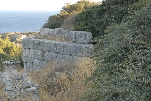 Die antike Stadt nahm damit wahrscheinlich eine Fläche von etwa 1000 mal 1300 Metern ein. Hier lebten zu Zeiten des Polykrates 15,.000 bis 20.000 Menschen. Mauerreste existieren heute noch am Ufer auf dem Weg vom Tarsanas-Strand zur Logothetis-Burg, an der schmalen Gasse, die entlang der Rückseite der Hotels Labito II und Stratos verläuft, und vor allem auf dem Ambelos-Hügel. Dort kann man der alten Mauer durch weitgehend wegeloses Gelände mehrere hundert Meter weit folgen.