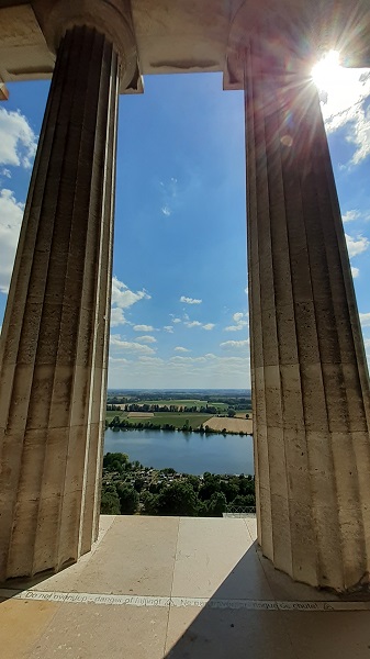 Ebenfalls erhaben ist der Blick vom Tempel über die Donau und das Land. Ein schönes Stückchen Erde unser Bayern. Eines ist König Ludwig I. mit Sicherheit gelungen: wie die Baumeister im antiken Griechenland wählte der König den perfekten Ort für sein Walhalla aus – im Gespräch waren ja auch, wie oben bereits geschildert, der Englische Garten, doch hier passt der „bescheidene“ Monopteros viel besser! Nein, hier auf der Höhe an einer der Kurven der Donau, hier ist der Ort der Walhalla. Sie zu besuchen war schon lange mein Wunsch. Mit dem 9-Euro-Ticket in der Tasche habe ich ihn mir erfüllt!
