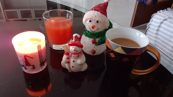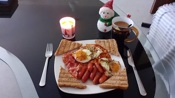 Dazu gab es Spiegeleier, Bacon, Baked Beans und Toast. Und natürlich Fruchtsaft und Weihnachtskaffee! Ein rundum leckeres Frühstück!