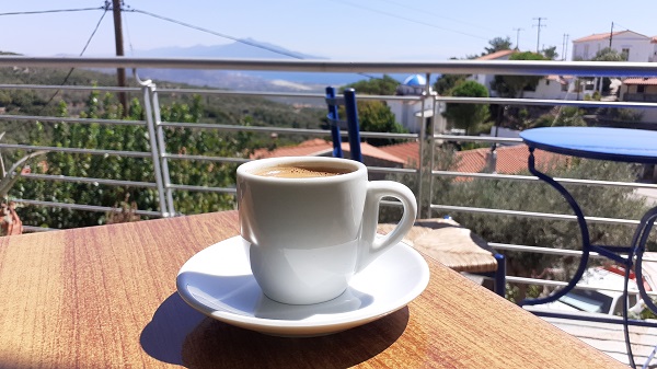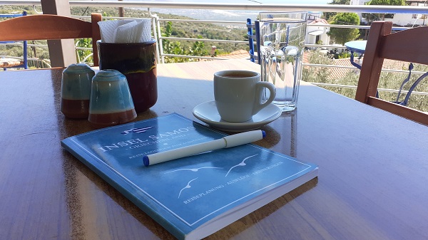 Jetzt hingegen genieße ich die wärmende Sonne und den lauen Wind, der mir hier um die Nase weht. Koumaradei ist heute vor allem bekannt für seine Töpferwaren und die Aussicht. Diese Pause ist ein idealer Moment um ein paar Zeilen in meinem Samiotischen Kaffee-Tagebuch zu ergänzen – bei einer Tasse griechischen Kaffee natürlich!