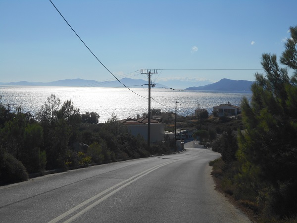 Der Rückweg beginnt am Ende der Welt. Obwohl erst früher Nachmittag geht es zügig wieder zurück. In die Dunkelheit möchte ich nämlich keinesfalls kommen. So lasse ich auch Psili Amos, Kambos und Ormos Marathokambou mehr oder weniger rechts liegen. Erst an der Kreuzung bei Koumeika halte ich kurz an.