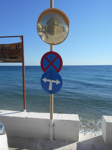 Mich faszinierte dieses Verkehrsschild direkt an der Stelle, an der die Straße vom Berg auf die Uferstraße trifft. Es fordert mich unmissverständlich auf, entweder nach rechts oder links zu fahren und nicht die kleine weiße Ufermauer zu durchbrechen und ins Meer zu fallen. Gutes Schild. Ich widerstehe der Versuchung hier auf den Sonnenuntergang zu warten. Vielleicht auch deshalb, weil die Tavernen geschlossen haben und ich keinen Kaffee bekomme.