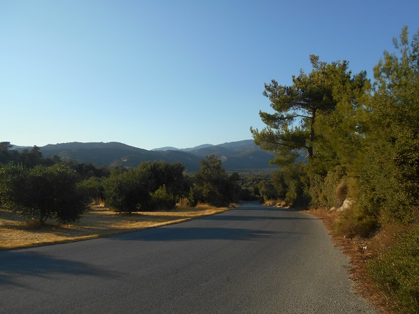 Auch an den Nebentischen sitzt man bei einem Kaffee oder Frappé. Die Umsätze dürften sich hier in Grenzen halten, was auch den niedrigen Preisen geschuldet sein wird. Auch der Kiosk – früher Garant für steige Einnahmen – ist geschlossen. Das liegt nicht nur an der Nachsaison. Orte wie Pagondas existieren in ewiger Nachsaison und sterben langsam aus. Ich mache mich wieder auf den Weg. Die Straße schlängelt sich sanft hinab ist Tal und zum Meer. Nach einigen scharfen Kurven führt nach rechts ein besserer Feldweg direkt nach Ireon. Hier fällt mir ein Turm auf halben Weg nach Ireon auf: der Turm des Sarakini, in manchen Reiseführern falsch mit Sarazenerturm übersetzt.