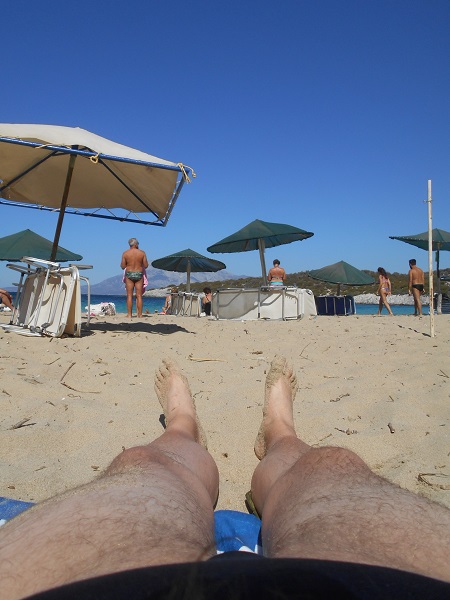 Später erfuhr ich, dass ich tatsächlich bei Käpt’n Andreas gelandet war, man die Amerikaner aber nicht mit an Bord haben wollte. Aus gutem Grund. Aber dazu später. Jetzt ging es erstmal zur Insel Samiopoula. Unterwegs gab es frische Orangen und Samos-Wein. Ein guter Start. An der Insel angekommen ging es von Bord und einen schmalen Pfad zu einer Bucht mit Sandstrand. Hier ließen wir uns nieder und – ja! – Tom ging nicht nur Baden, er legt sich auch in die Sonne an den Strand.