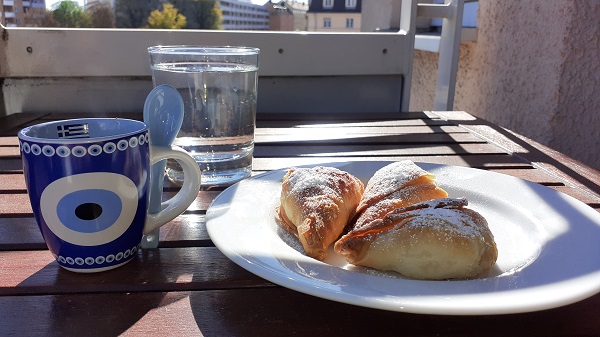 Bei mir geht ja Urlaub immer in die Verlängerung. Wie ich das mache? Zum großen Teil mit meinen Mitbringseln. Darunter griechische Lebensmittel – natürlich vor allem griechischer Kaffee, aber auch Oliven, Chips, Kekse, Wurst und anderes. Ein besonderes Highlight immer wieder meine Kaffee-Momente auf dem Balkon. Wie hier im Bild: griechische Teigteilchen und griechischer Kaffee aus meiner neuesten Mitbringseltasse.