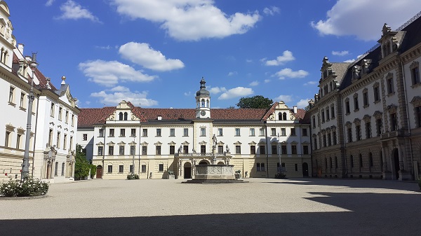 Das Schloss selbst habe ich nicht besichtigen können, der freundliche Pförtner aber gestatte mir einen Blick in den Innenhof, so dass ich dieses Foto machen konnte. Das Schloss St. Emmeram oder Schloss Thurn und Taxis ist ein Schloss des Fürstenhauses Thurn und Taxis in Regensburg, das nach Um- und Neubauten Ende des 19. Jahrhunderts aus den Gebäuden des Klosters St. Emmeram entstanden ist, nachdem das Kloster 1810 dem Fürstenhaus übereignet worden war. Übrigens Regensburgs Fotomotiv Nummer eins. Kein Wunder, bei diesem schönen Schloss unter unserem schönen bayerischen, weißblauen Himmel.