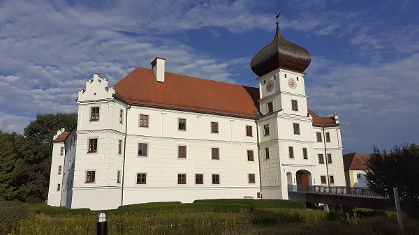 Das Schloss unweit der Glonn ist umringt von einem gut gefüllten Wassergraben. Zu drei Vierteln wird der Graben von einer Parkanlage umgeben, an deren Ausläufern besagtes Tagungshotel, ehemalige Wirtschaftsgebäude, die heute den Veranstaltungsraum „Alte Galerie“ beherbergen, ein Bolz- und Spielplatz und ein Biergarten liegen. Das Areal ist jedenfalls groß genug, um sich die Beine zu vertreten. Auch für einen Kaffee in der Morgensonne reichte meine Zeit. So konnte ich erholt und gestärkt in meinen Rest-Tag starten.