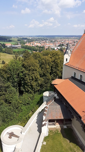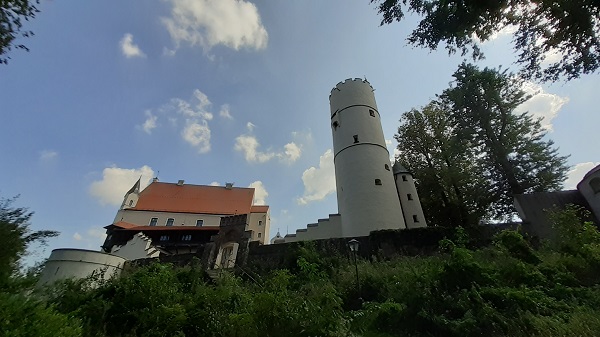 Der Eingang für Fußgänger ist das Ergebnis eines romantisierten Burgausbaus während seiner wechselvollen Geschichte. Original erhalten ist allerdings der stolze Bergfried, von dem aus man einen tollen Blick über das Land und die Stadt Mindelheim hat. Hoch über der Turmspitze flattert die bayerische Flagge im Winde. Weit ist es nicht mehr bis zur Landesgrenze, aber noch sind wir im Freistaat.