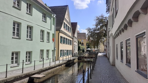 Die Bahnfahrt dauert nur eine Kaffeelänge. So habe ich auch gleich genügend Energie für meine Tour. Mein Plan: im Uhrzeigersinn einmal um die Altstadt herum und dann von Norden ins Zentrum. Da der Bahnhof an der Ostseite der Altstadt liegt führen mich also mein ersten Schritte nach Süden. Hier treffe ich zum ersten Mal auf den Stadtbach, auch bekannt als Memminger Ach.