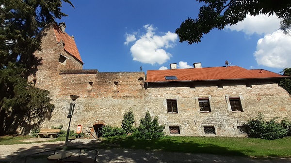 An der linken Seite schließt sich der Soldatenturm an. Als Rückwand dient die Stadtmauer. Heute sind in der Roten Kaserne Wohnungen untergebracht. Hier kann ich gut erkennen, wie die heutige Bausubstanz mit der des Mittelalters verschmilzt. An manchen Ecken – wie hier – kann man kaum zwischen Stadtmauer und Wohnraum unterscheiden, weil beides zusammengewachsen ist.