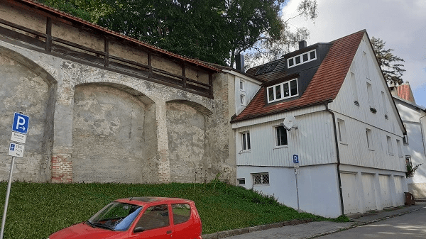 Auch die Stadtmauer selbst – wie hier am Fußgängerdurchgang – dient als Wohnraum. In diesem Fall sogar mit Blick auf den Kaisergraben. Der war früher ein Teil des Verteidigungssystems. Heute ist er allerdings einer der wenigen Parkanlagen in der Altstadt.