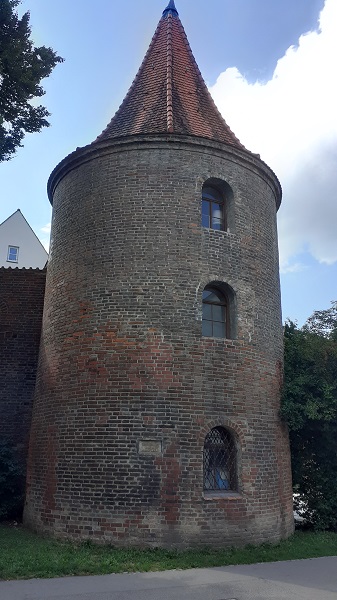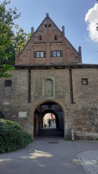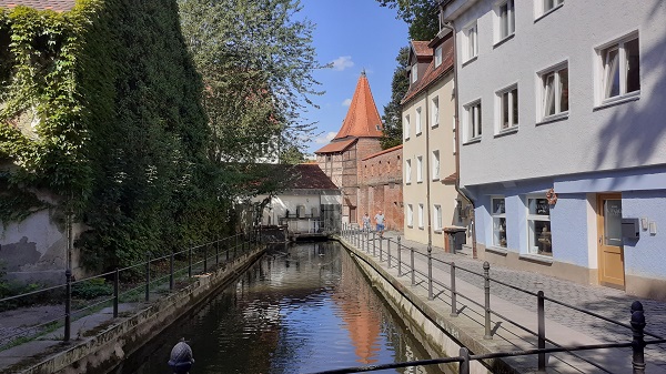 Erhalten ist dafür der Bettelturm. Der Bettelturm wurde 1471 bei der letzten Stadterweiterung als Geschützturm erbaut. Mit der Erfindung des Schießpulvers und der Entwicklung von Kanonen, wurde diese Form der Verteidigung notwendig. Er diente vor allem dazu, den Einlaß und den Stadtgraben abzusichern. Woher sich der Name ableitet, ist nicht bekannt. Er diente im 19. Jahrhundert auch als Armenhaus. Hier begegnen wir auch der Memminger Ach, dem Stadtbach wieder.