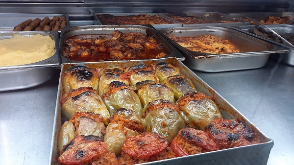 Zuerst entdeckte ich, dass man in Thessaloniki abseits der teuren Restaurants gut, einfach und vor allem günstig essen kann, wie dieses Bild mit Gemista belegt.