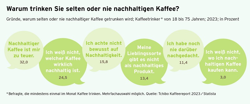 Ausreden gibt es viele. Fast die Hälfte der Konsumenten gibt offen, dass ihnen nachhaltiger Kaffee schlicht zu teuer ist oder dass ihnen Nachhaltigkeit nicht wichtig ist. Ein Viertel weiß kau etwas über nachhaltige Produkte. Etwa jeder zehnte hat einen anderen Lieblingskaffee oder hat sich über das Thema noch gar keine Gedanken gemacht.