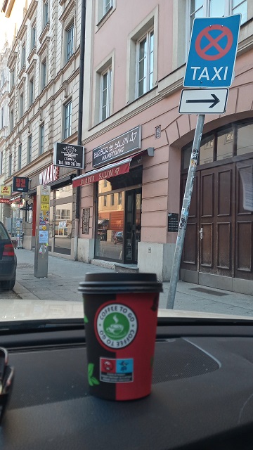 Mich begrüßt ein freundlicher Verkäufer. Mit 2,70 ist der Kaffee nicht unbedingt billig, dafür ist er kräftig und wird liebevoll mit einer professionellen Siebträgermaschine zubereitet. Frischen Milchschaum gibt es gratis dazu! Ich genieße den heißen Muntermacher Stilecht vom Fahrersitz meines Taxis aus. So gestärkt kann es in die zweite Schichthälfte gehen…