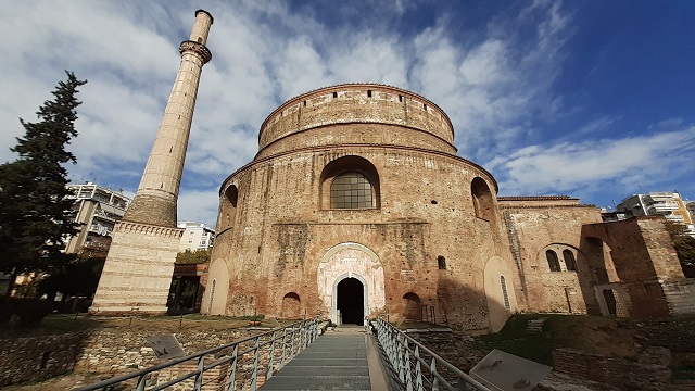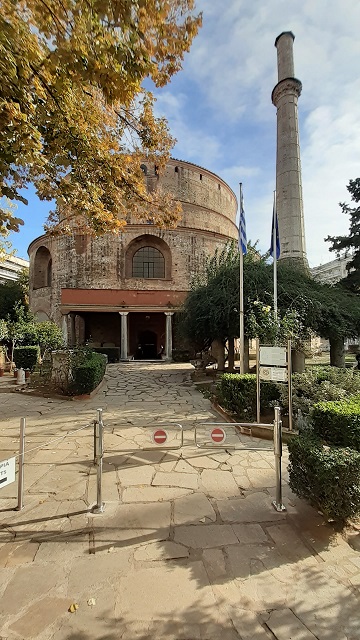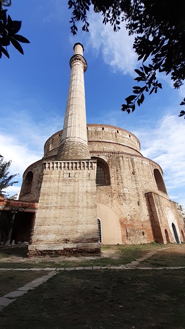 Mausoleum eine größenwahnsinnigen Kaisers oder Pantheon? Heute ist die ursprüngliche Funktion dieses Baus umstritten, auch wenn vieles dafür spricht, dass sich Kaiser Galerius hier selbst ein Denkmal setzen wollte. Eindeutig ist das Vorbild: das Pantheon in Rom. Damals, zu Beginn des vierten Jahrhunderts, war die Rotunde mit knapp 30 Metern Höhe und einem Durchmesser von fast 25 Metern die größte Ziegelkuppel der Welt. Die Rotunde steht auf der Achse der Prozessionsstraße, die den Galeriusbogen mit dem Galeriuspalast verband, in der Nähe des heutigen Navarinou Platzes.