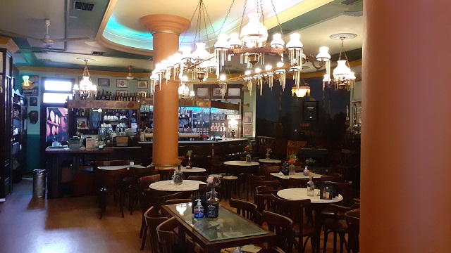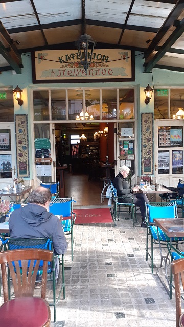 Ich trete durch das Portal und kehre zurück in die Gegenwart. Eine Stärkung wäre recht. So suche ich das nur wenige Schritte entfernte Cafe Prigipos. Es gilt als eines der besten – wenn nicht sogar das beste! – Cafés der Stadt, mit dem Geist des traditionellen griechischen Kaffeehauses. Die Dekoration ist eine Zeitreise in ein Griechenland vor 50 Jahren und voller Antiquitäten.