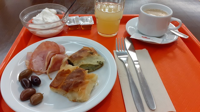 Mein vorletzter Tag in Athen beginnt mal wieder mit einem Frühstück im Hotel Marina. Von Schiffen oder Meer kann natürlich keine Rede sein. Das Hotel Marina liegt ganz in der Nähe vom Omonia-Platz und das Frühstück ist ok. Spanakotiropita, Tiropitakia, gebratener Schinken, ein paar Oliven, griechischer Joghurt mit Honig, Grapefruitsaft und natürlich Kaffee. Genug für einen gelungenen Start in den Tag. Jetzt bin ich bereit für große Taten.