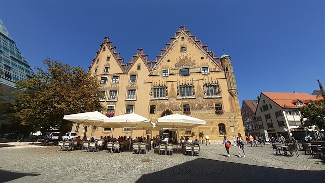 Von dort ist es nicht weit zum historischen Rathaus von Ulm. Das Ulmer Rathaus zählt nicht zuletzt wegen der Fassaden-Wandmalereien und einer astronomischen Uhr zu den herausragenden Baudenkmälern der Stadt. Seine komplexe Baugeschichte – es besteht aus drei verschiedenen Bauteilen – begann im 14. Jahrhundert. Sein jetziges Aussehen geht im Wesentlichen auf die Frührenaissance zurück.