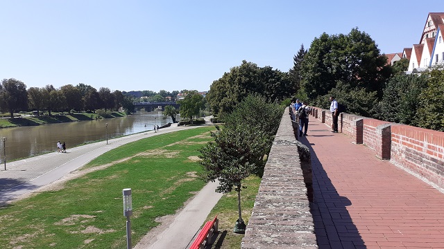 Jetzt werfe ich noch einen Blick auf die Stadtmauer am Donauufer. 1480 im „reißenden Wasser der Donau“ gebaut, wurde die Stadtmauer als Bollwerk gegen feindliche Armeen errichtet. Tatsächlich reichte der Fluss damals bis an die Stadtmauer heran. Heute kann man vor der inzwischen wohl gezähmten Donau auf der Wiese flanieren.