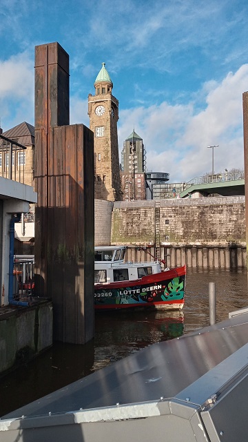 Ich nutzte ein kleines Loch in der ansonsten eher geschlossenen Wolkendecke um den Landungsbrücken einen Besuch abzustatten. Das ist auch ganz einfach: man steigt einfach bei der gleichnamigen S-Bahn-Station aus und lässt sich vom Touristenstrom bis an den Kai spülen. Am besten man ignoriert die Buden ganz am Anfang. Die sind unnötig teuer.