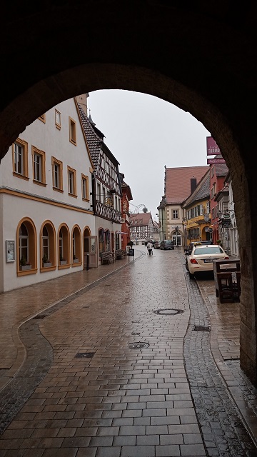 Ich folgte der Beschilderung von der Staatsstraße 2260 zur oberen Altstadt und erreichte so das Obere Tor. Die Altstadt von Volkach liegt oberhalb des Mains und bietet ein beeindruckendes Ensemble. Volkach entstand in seiner heutigen Form im Zuge des Aufstiegs zur Stadt im 12. und 13. Jahrhundert. Ausgebildet präsentierte sie sich als Zweitorestadt, die auf einer hochwasserfreien Terrasse nach Süden sowie nach Nordwesten ausgerichtet war. Die Wegeverteilung übernahmen die zwei Vorstädte vor den Toren, die heute allerdings nicht Teil des Ensembles sind.