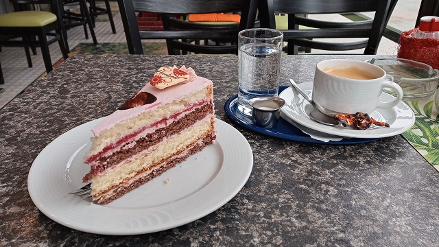 Meine Wahl fiel daher auf die Himbeertorte, wobei ich das unschlagbare Kaffee-Torte-Soda-Angebot für sechs Euro in Anspruch genommen habe – und wurde nicht enttäuscht. Die Himbeertorte ist ein echter Klassiker – gutes, altes Konditorenhandwerk! – und der Kaffee lecker. Dazu ein (kleines) Glas mit Sodawasser aus Kufstein. Authentischer geht es nicht. Für Kaffee & Kuchen in Kufstein eine erste Adresse!