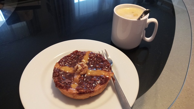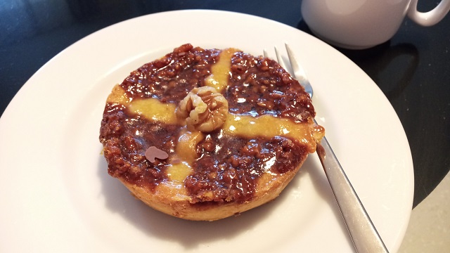 In diesem Fall ein leckeres Walnuss-Teilchen, die genaue Bezeichnung habe ich vergessen. Doch als ich dieses liebliche Törtchen in der Auslage erblickte, da war es um mich geschehen: das gute Stück musste mit. Ich widerstand allerdings der Versuchung es mir gleich einzuverleiben, sondern ich hob es bis zu meinem freien Tag auf, damit ich es zur Kaffeestunde verzehren konnte.