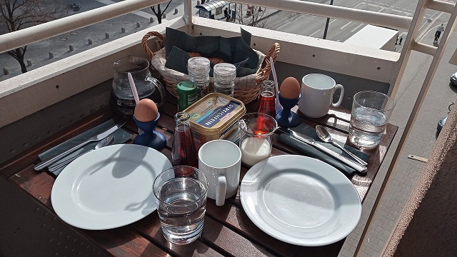 Am Karsamstag gab es dafür ein üppiges aber fleischloses Frühstück auf dem Balkon: frisch aufgebackene Croissants mit Butter und Eier. Dazu ein alkoholfreier Aperitif und ein besonders leckerer Kaffee, nämlich der Sholi Rwanda, die erste Kaffee-Rarität dieses Jahres von Tchibo. Der stammt von der Kooperative „Abateraninkunga Ba Sholi“ – übersetzt: „gegenseitige Hilfe“.