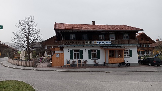 Ein Bankerl am Bach lädt zum Verweilen ein. Ein ganz besonders toller Blick aufs Moor bis zu den Lenggrieser Alpen. Dahinter plätschert ein lauschiger Bach. Nach kurzer Rast geht es durch die Attenloher Filzen zurück nach Gaißach. Und hier zum Gasthaus zur Mühle. Wir sind nicht die einzigen Wanderer, die hier heute einkehren. Eigentlich macht die Speisekarte Lust darauf kulinarisch zuzuschlagen. Wir begnügen uns aber mit Kaffee und Kuchen. Der Kaffee ist gut, der Kuchen – ein Kirschstreusel – besonders lecker.