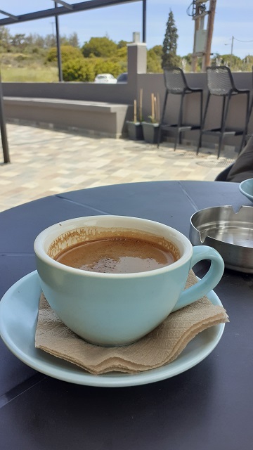 Wir nehmen die Straße nach Chania. Doch jetzt brauchen wir erstmal einen Kaffee! Fündig werden wir im „espressaki“ in Pithari, einem kleinen Vorort von Chania. Ein schönes Café mit großartigem Kaffee, einem sehr aufmerksamen Personal und einer guten Auswahl an Snacks, Sandwiches und Desserts. Uns steht der Sinn allerdings vordergründig nach Kaffee, genauer gesagt griechischem Kaffee, dem ersten griechischen Kaffee auf griechischem (kretischen) Boden um präzise zu sein – heiß und bitter-süß wie das Leben! Erstmal ankommen – und dann in aller Ruhe den nächsten Schritt planen. Der wird das Kloster Agia Triada sein. Doch erstmal genießen wir die Atmosphäre und unseren griechischen Kaffee!
