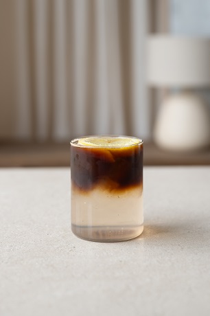 3. Den abgekühlten Espresso hinzugeben und mit einer Scheibe Zitrone garnieren.