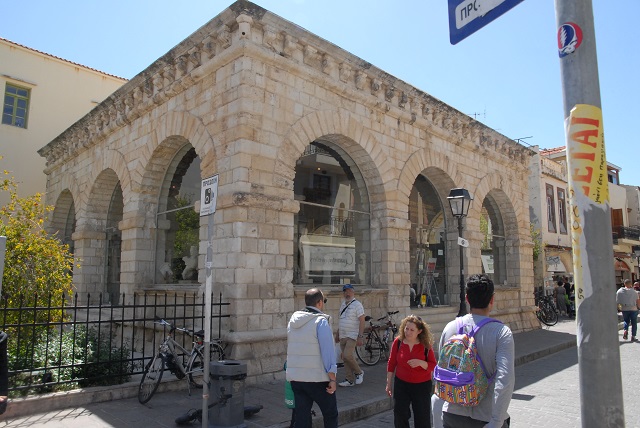 Ebenfalls verwehrt blieb uns der Zugang zur großen Fortezza, zur venezianischen Festung, da Ostermontag in Griechenland. Kein Haken also. Dafür war uns im vorbeigehen die venezianische Loggia, ein Relikt aus dem 17. Jahrhundert, einen Haken wert. Alle vier Seiten des einstöckigen quadratischen Bauwerks aus hellem Kalkstein sind von hohen Rundbogen-Portalen durchbrochen, die ihrerseits von beinahe ebenso großen Fenstern flankiert werden. Der repräsentative Bau diente dem venezianischen Adel seiner Zeit als Versammlungshaus und Debattierclub, heute werden hier teure Repliken kostbarer Antiken feilgeboten.