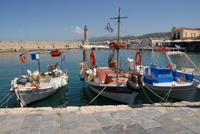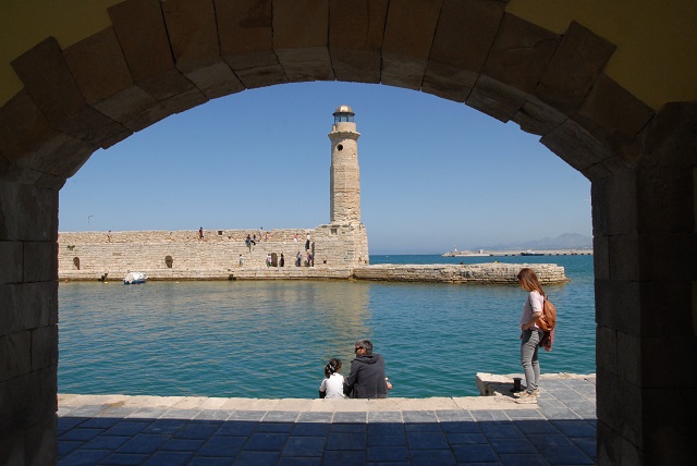 Drängeln wir uns nun zum venezianischen Hafen durch. Hier entdecken wir sogleich das Wahrzeichen von Rethymno, den Leuchtturm. Er ist mit etwa 9 m Höhe der zweitgrößte Leuchtturm auf Kreta und wurde 1830 in osmanischer Zeit unter ägyptischer Besatzung erbaut. Von hier aus bietet sich ein schöner Blick auf die Hafenmole mit ihren bunten Fischerbooten und pastellfarbenen Häusern im Hintergrund.