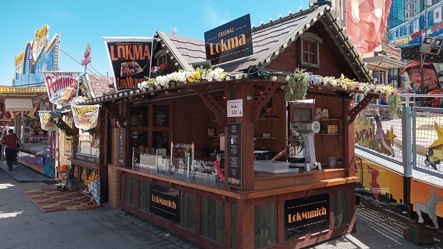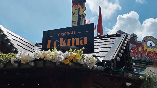 Dieser Stand ist mir aufgefallen: auf dem Münchner Frühlingsfest wurden Lokma angeboten, die türkische Version der griechische Loukoumades, wie ich sie von Samos und Athen kenne. Passte nicht zum Bier, weshalb ich diesem Stand einen Extrabesuch abstattete. Beim ersten Versuch war ich zu früh dran, denn der klassische Sirup, mit dem die frisch frittierten, etwa walnussgroßen Hegeteigbällchen überzogen werden, war noch nicht fertig. Dafür bekam ich bei meinem zweiten Anlauf auch neun, statt der bezahlten sechs Lokma.