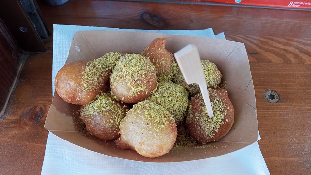 Ich hatte die türkische Originalversion mit Sirup und gehackten Pistazien, die anderen Varianten mit diversen Saucen und Nutella reizten mich wenig. Ich stehe halt mehr auf Authentizität – und wurde nicht enttäuscht. Ein total leckerer Snack, wenn auch mit regulär sechs Euro für sechs Lokma kein ganz billiges Vergnügen. Aber was ist heutzutage schon billig? Eben!