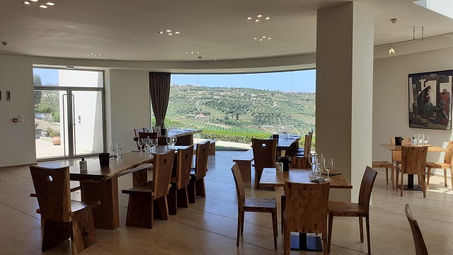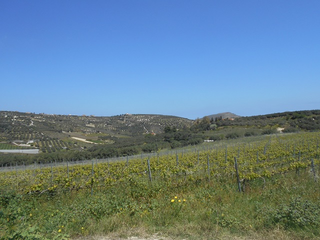 Dann wollten wir noch bei der Weinkellerei Boutari, eines der modernsten Weingüter Kretas, bei Skalani vorbeischauen. Eigentlich ein verlockender Ort, leider gibt es für Gäste ohne vorherige Buchung, also Leute wie uns, Wein nur in ganzen Flaschen – ein einzelner Schoppen ist nicht vorgesehen. Und die Kulinarik dort ist eher hochpreisig. Das hätte Kostas besser recherchieren können, aber nachdem wir viel zu spät losgefahren sind, hatte er noch was bei uns durch. Außerdem befindet sich dieser Ort inmitten einer wundervollen Landschaft. Sanfte Hügel und üppig bepflanzte Weinberge, dazwischen windet sich eine schmale Landstraße. Ein Besuch lohnt also schon alleine wegen des Ausblicks.