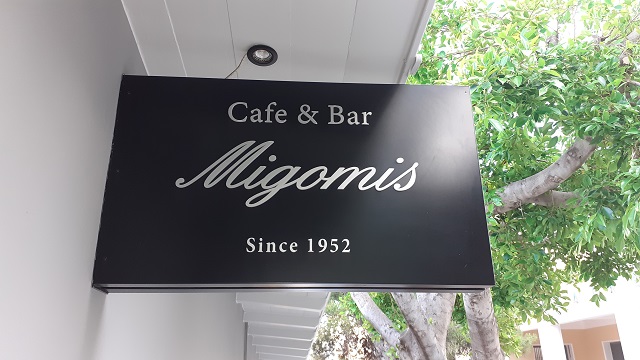 Migomis Piano Restaurant & Café, Nikolaou Plastira 20, Nikolaou Plastira 22, Agios Nikolaos, Kreta, Griechenland; Öffnungszeiten: ganzjährig täglich 08:00 – 02:00 Uhr. Quelle: John Bowman, Hanni Guanella, Kreta, Ein Reise- und Kunstführer, 1965, Flammberg Verlag. Rechtschreibung beibehalten.
