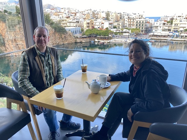 Auch bereits Geschichte ist das Café von dem man die beste Aussicht auf den See hat. Der Inhaber eines Geschäfts wusste die Antwort: Das Café sei geschlossen und das Migomis Piano Restaurant sei ein guter Ersatz mit einem vergleichbaren Blick auf den See. Also kehrten wir dort auf einen griechischen Bergkräuter-Tee und zwei Cappuccino Freddo ein und genossen die Aussicht. Hier konnten wir ein ganz besonderes Schauspiel beobachten: am steilen und felsigen Ostufer des Sees nisten in kleinen Höhlen und auf kleinen Vorsprüngen Tauben. Die allerdings werden bei jeden „Ausflug“ von Möwen verfolgt und gejagt.