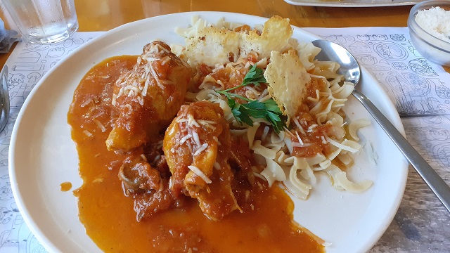 Ein langgehegter Wunsch: kretische Nudeln! Die gab es mit Huhn in Tomatensauce. Das Huhn butterzart. Ein tolles Gericht.