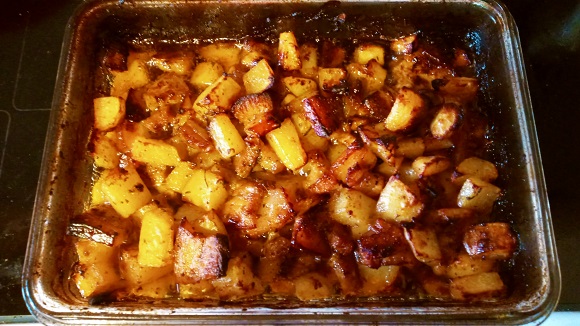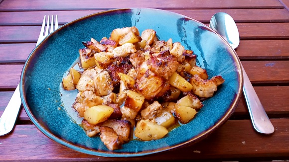 Ich habe es mir leicht gemacht und bereits gewürzten Schweinebauch gekauft. Den gab es nämlich gerade im Angebot. Allerdings wird das Gericht damit etwas, na nennen wir es reichhaltiger. Weshalb ich das überschüssige Fett am Ende entfernt habe. Auch habe ich die letzten 20 Minuten im Ofen den Deckel wieder entfernt, damit es etwas „krustiger“ wird. Mit dem Ergebnis war ich dann mehr als zufrieden: krosse Kartoffeln und Fleisch, dass auf der Zunge zergeht.