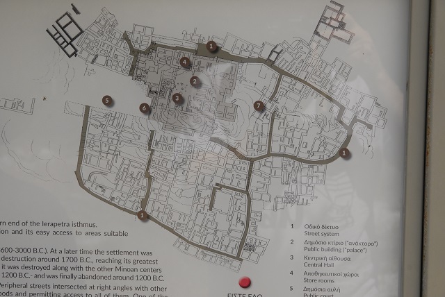 Offensichtlich hatten die Minoer keine äußeren Feinde zu fürchten, denn es fehlen jede Art von Verteidigungsanlagen. Man vermutet, dass die Minoer über eine schlagkräftige Marine verfügten, die mögliche Feinde schon auf See abwehren konnte. Der Marktplatz, die sogenannte Agora, liegt im Süden der Stadt auf einem Plateau. Von dort aus hat man einen schönen Blick auf die Bucht. Im Norden der Agora schloss sich der oben bereits beschriebene palastähnlicher Gebäudekomplex an, von dem aber nur noch Grundmauern und Säulenstümpfe übrig sind. Auch eine Art Schautreppe, eine Stoa, ist auch vorhanden.