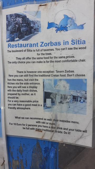 În Zorbas Taverne gibt man sich unbescheiden: „Der Boulevard von Sitia ist voll von Tavernen. Man sieht den Wald vor lauter Bäumen nicht. Sie alle bieten das selbe Essen zum selben Preis an. Die einzige Wahl, die Sie treffen können, ist die des bequemsten Stuhls.
