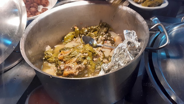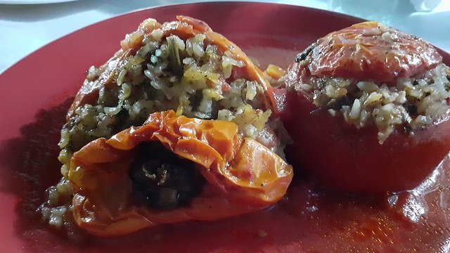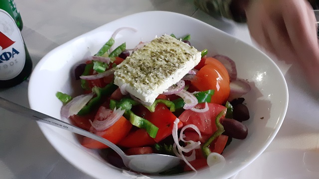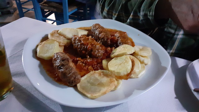 Nach kurzer Rast machen wir uns auf den Weg zur Taverne. Relativ hungrig, wie wir sind, ist es doch schwierig bei dieser unglaublichen Auswahl an kretischen Gerichten das passende auszusuchen. Wir gönnen uns eine Flasche Wein aus dem Kloster Toplou, das wir morgen besuchen werden. Wir entscheiden uns für den obligatorischen griechischen Bauernsalat, Fava, Gemista, Souzoukakia und Augergine Imam – alles außerordentlich lecker.