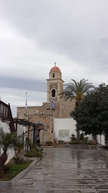 Im Laufe der wechselvollen Geschichte wurde das Kloster mehrmals zerstört und wiederaufgebaut. Heute zeigt sich das Kloster als aufwändig rekonstruiert und präsentiert sich den zahlreichen Besuchern als kleines Schmuckstück. Vor langer Zeit waren die Mönche des Klosters Selbstversorger, eine restaurierte alte Windmühle im äußeren Hof zeugt davon. Heute noch wird hier Wein und Olivenöl nach Bio-Standard erzeugt. Ein ausgeprägter Devotionalienhandel ergänzt das Angebot. Dabei sind die Waren hier oft teurer, als anderswo. Den Wein aus dem Kloster, den wir gestern schon in der Taverne Zorbas genossen haben, haben wir hier deshalb auch stehen lassen. Rückblickend betrachtet zum Glück, denn jeder Mini Market bot die Tropfen 20-25% unter dem Preis an, der in Toplou aufgerufen wurde.