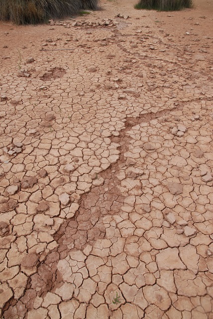 Auf dem Weg zurück zum Auto vielen uns diese Muster im ausgetrockneten Boden auf. Klar war, dass beim Austrocknen diese Risse entstehen, die die Muster Bilden. Rätselhaft blieb und allerdings, weshalb sich mehrere kleine Gräben oder Furchen wie von selbst bildeten. Dabei sind wohl einige der Stücke des trockenen Bodens regelrecht abgeplatzt. Vielleicht kann ja jemand aus meiner Leserschaft dieses Geheimnis lüften.