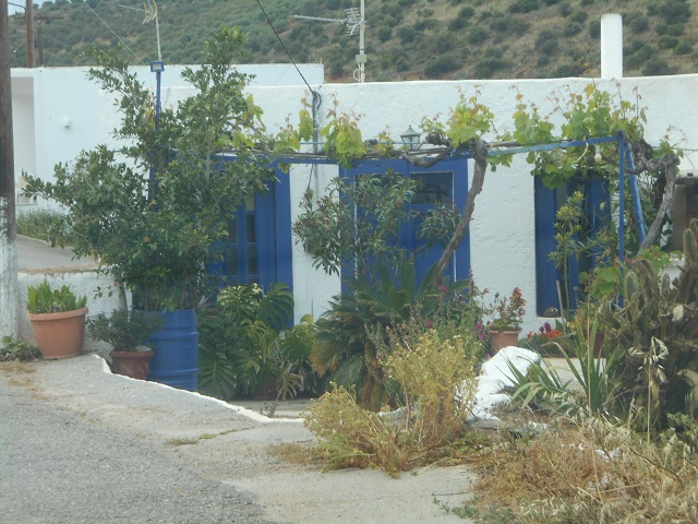 Ich hatte mir extra bei Google Maps explizit die richtige Abzweigung eingeprägt. Bei der Telefonzelle sollte es links in die kleine Gasse gehen. Die Kreuzung gab es, ebenso die Telefonzelle und die Gasse – das Kafenio nicht. Beziehungsweise nicht mehr. Dieser Geheimtipp war wohl so geheim, dass das Café irgendwann in den letzten Jahren geschlossen wurde, aber das hübsche Gebäude samt Terrasse konnten wir identifizieren, wenn auch unter Mühen, unser Mietauto hätte breiter nicht sein dürfen.