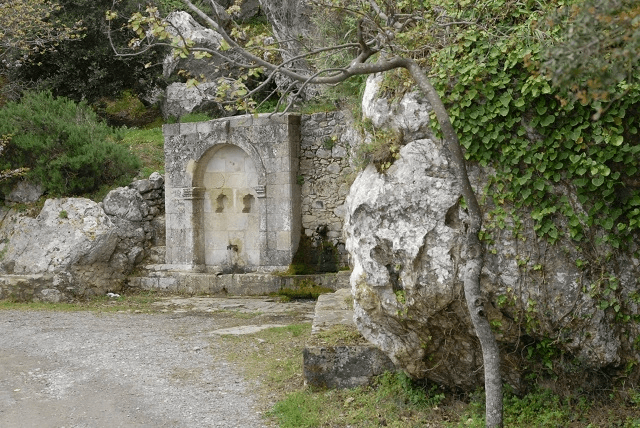 Am Dorfeingang befindet sich eine von Türken eingefasste Quelle, zumindest legen das die Ornamente nahe. Der gesicherte Zugang zu frischem Wasser dürfte zur Standortwahl beigetragen haben. Der steile Hang bildet im Südosten eine natürliche Befestigung, während die Gebäude an der Nord- und Westseite, die das Tal überblickt, geschlossene, festungsartige Fassaden aufweisen.