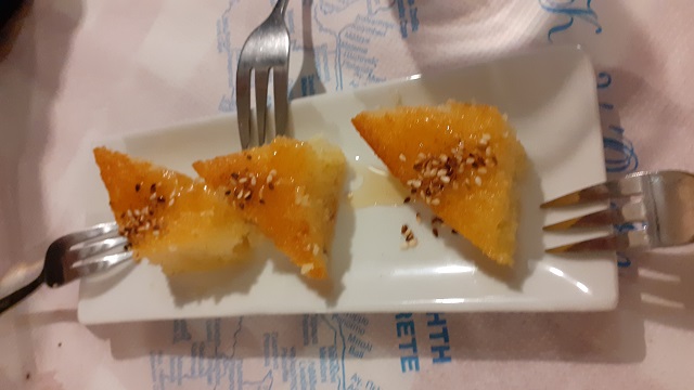 Davon lassen wir uns aber nicht entmutigen und entscheiden uns für frittierte Aubergine, gefüllte Zucchiniblüten Kolokitholoulouda, Fleischbällchen Keftedes, Zucchinipuffer Kolokithokeftedes und natürlich die Gigantes, in Tomatensauce gebackene weiße Riesenbohnen, die wir ja schon von Anfang an im Sinn hatten. Man wird zu dritt mit vier Vorspeisen locker satt. Außerdem bekamen wir sogar zweimal Nachtisch! Einmal Zitronenkuchen und einmal Joghurt mit Honig.