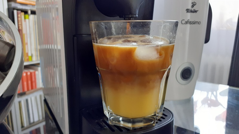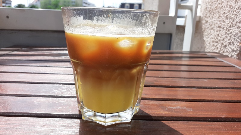 Das Rezept ist denkbar einfach: Eiswürfel in ein Glas, ein Espresso darüber, mit Orangensaft aufgießen. Wegen des netten, optischen Effekts lässt sich das Verfahren auch umdrehen, also Eiswürfel, O-Saft und Espresso. Und jetzt die Überraschung: das schmeckt. So lecker und erfrischend, dass ich mir gleich noch einen zweiten davon genehmige.